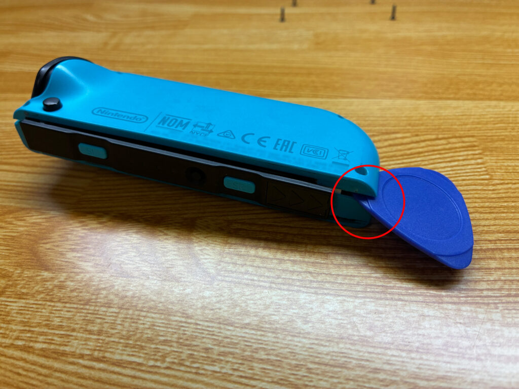 Y字ネジを外したあとはケースを外していきます。画像のようにつなぎ目にピックなどを差し込みケースを外していきます。配線がありますので配線を切らないように注意深く進めてください。