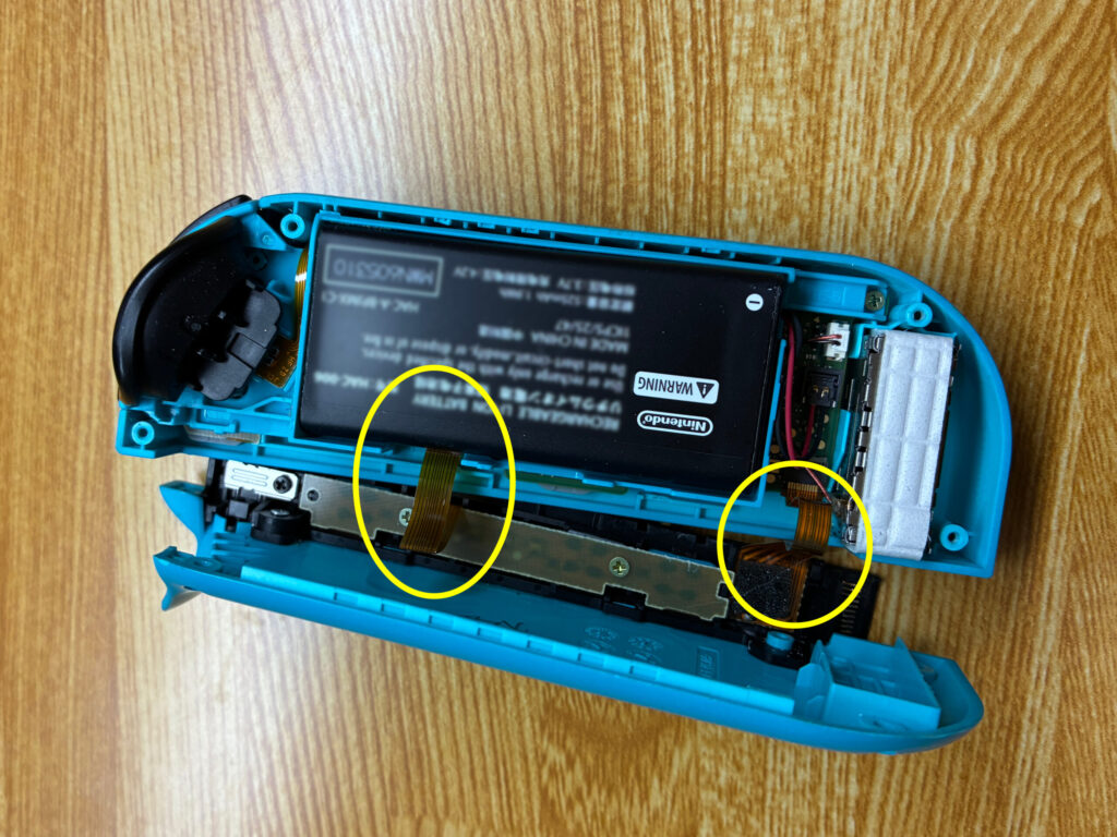つなぎ目をピックなどで外していき開きます。この際に黄丸部分2カ所に配線(フレックスケーブル)がありますので切断しないように注意してください。もし誤ってケーブルを切断してしまっても諦める必要はありません。修理キットの中に同梱されている場合もありますし、別途ケーブルのみを購入することも可能ですのであまり神経質にならずにリラックスして進めていきましょう。