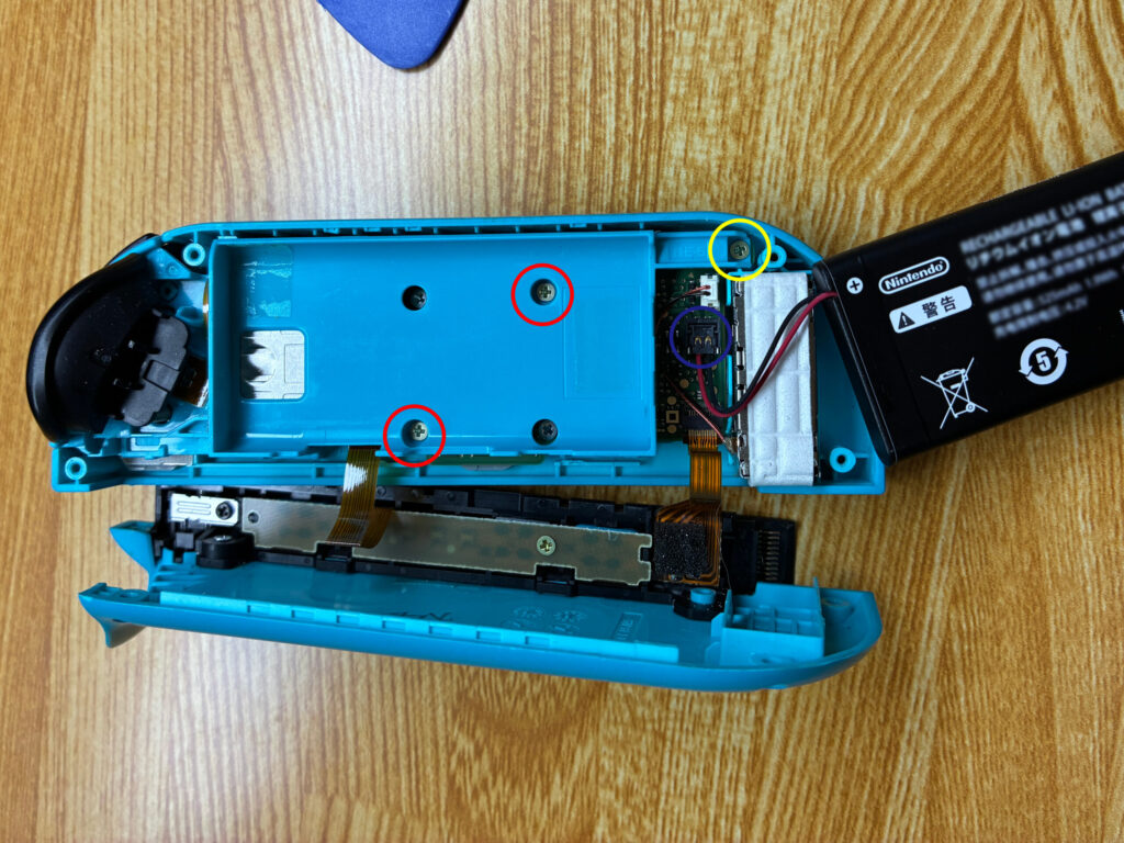 次にバッテリーを外します。バッテリーパックをピックなどで持ち上げて取り外していきましょう。本当は青丸部分のコネクタを外して作業しなければなりません。が今回は趣味の範囲な(面倒だった)ので外さずに進みました。バッテリーを接続したまま作業をするのは大変危険なのでみなさまは必ず外してください。特に金属製のピンセットなどが基盤に触れた場合ショートしたり、場合によっては発火の恐れがあります。