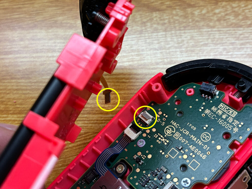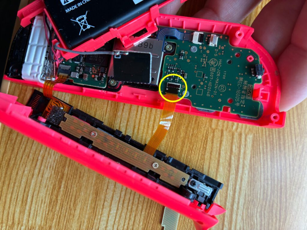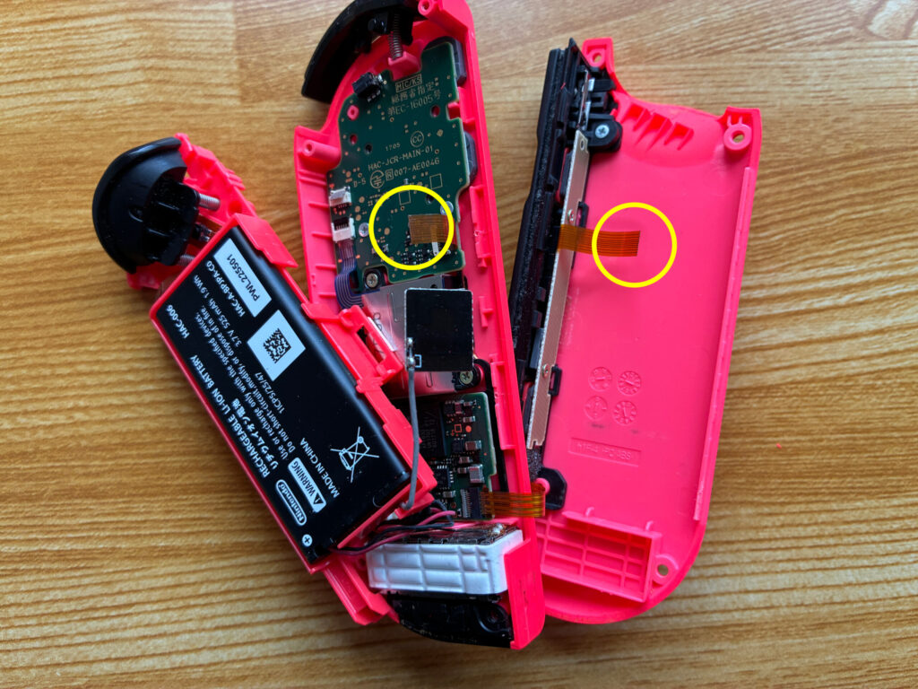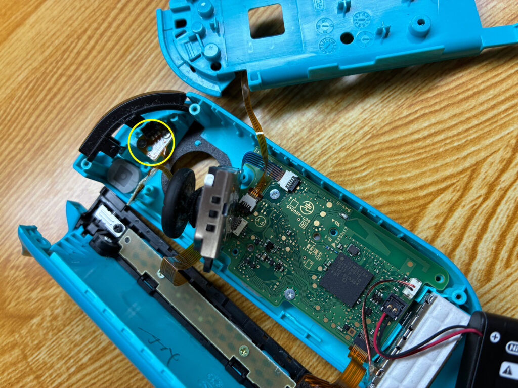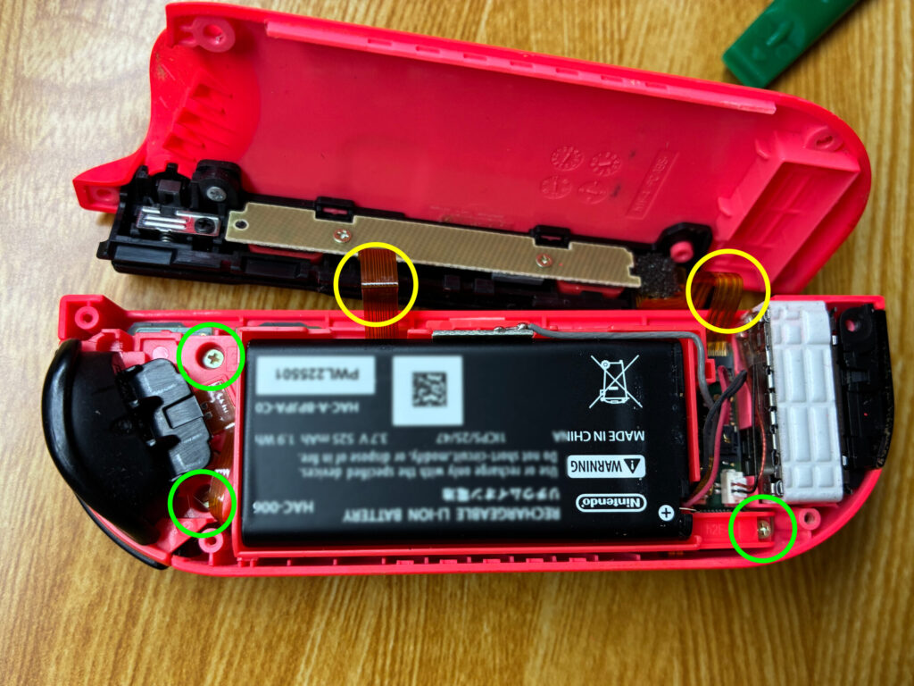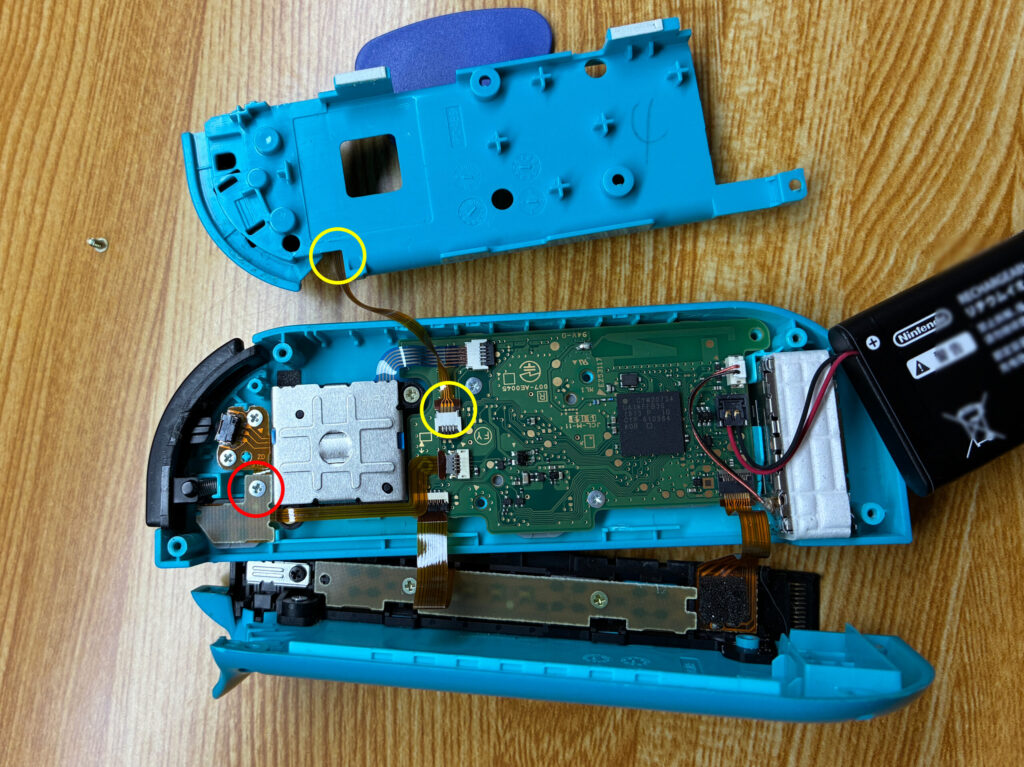さて、作業を戻りまして本題のスティック交換です。画像は配線が切れてしまった状態でやっているのですが、配線を外してから行うことを強く推奨します(笑)。黄丸のプラスネジを外して、緑丸の配線を引き抜けばスティック部品を取り外し交換することができます。スティック部品は左右共通部品なので左をやった時と同じ要領でやればOKです。