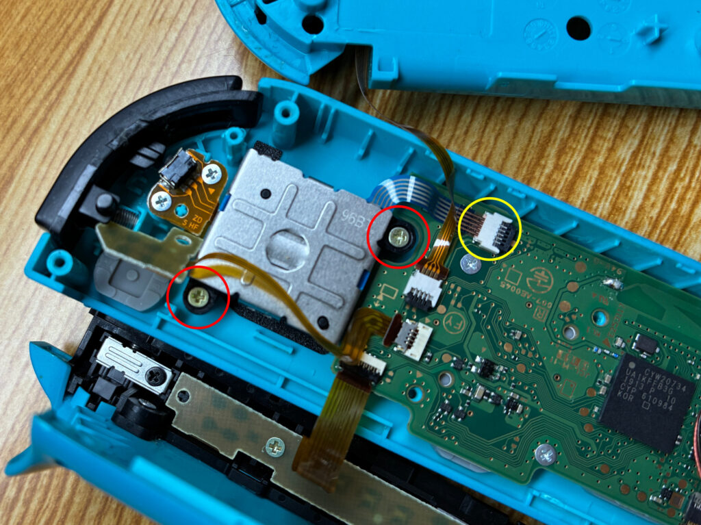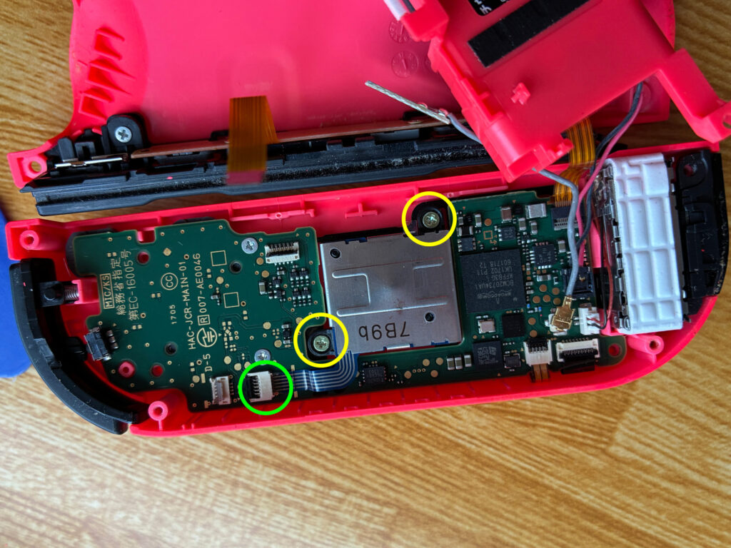 先ほどのネジを外して小さな基盤をめくると配線の裏側にネジがあることがわかります。画像赤丸部分のネジ2カ所と黄丸部分の配線を外してスティックを取り外し交換してきましょう。この配線は引っ張ると抜けます。